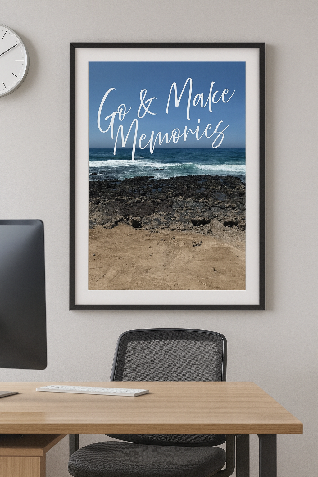 Bring the tranquillity of the ocean and the power of intention into your space with "Arona Rocks" a coastal inspired motivational art print that blends raw volcanic texture with peaceful blue tones. Sizing16x20inches Matte Premium print.